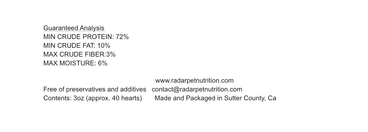 Rich in essential amino acids, chicken hearts provide lasting energy and help maintain lean muscle mass, making them an excellent choice for active dogs and cats. Their small, bite-sized shape makes them perfect for training rewards, meal toppers, or a healthy everyday snack. With no additives, grains, or preservatives, Dehydrated Chicken Hearts are a clean, wholesome option you can feel good about.